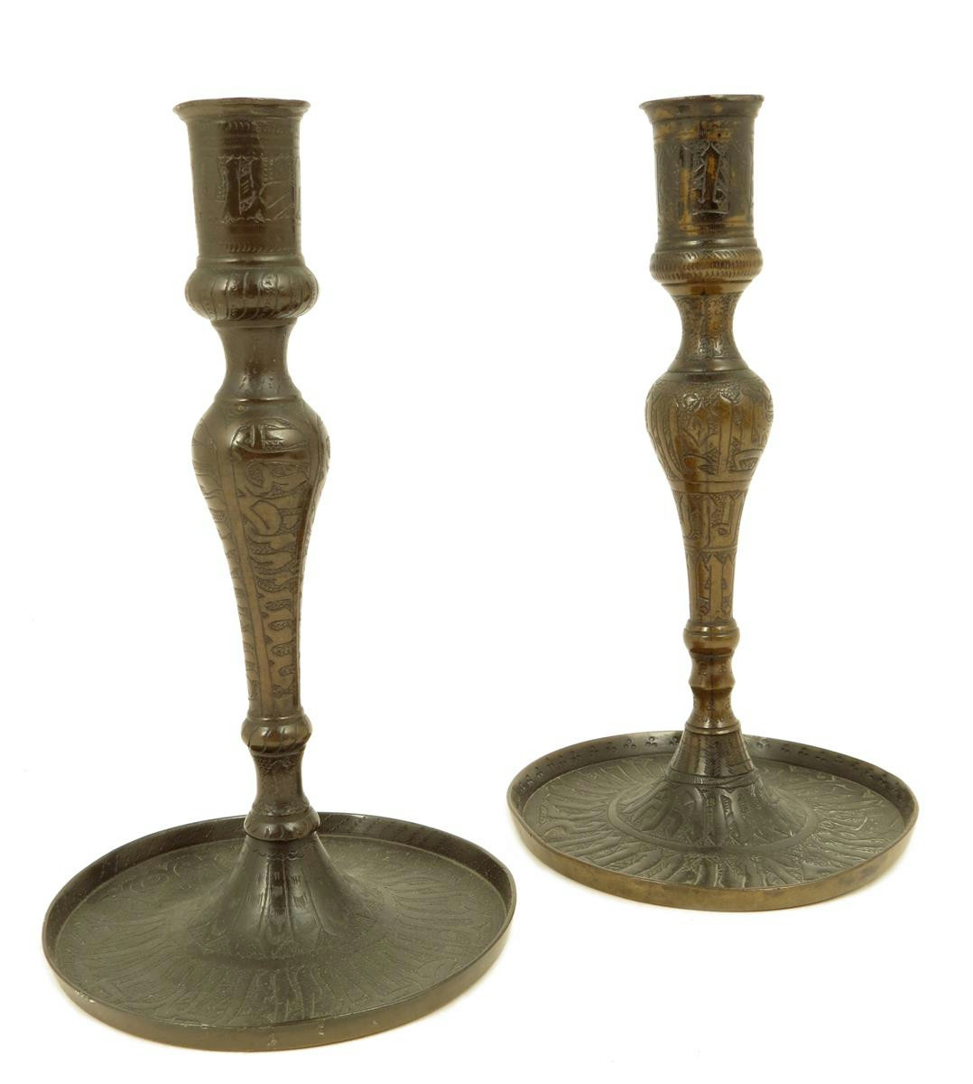 Two similar brass / bronze candlesticks, each with an inverted baluster stem with interlaced Islamic style decoration, one with a bird, on dished circular bases, possibly Ottoman or Persian 17th century, 19.3cm high, 11cm diameter, max. (2)