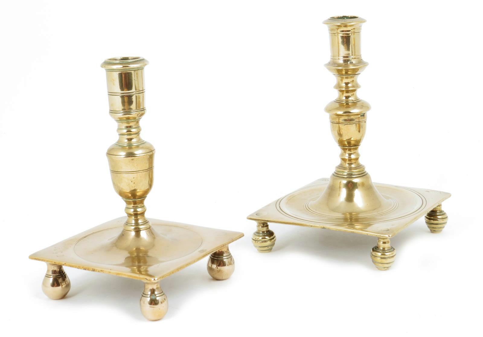 Two similar continental brass candlesticks, each with a turned stem on a dished square base on turned supports, one engraved with initials, possibly 17th century Dutch or Spanish, 19.5cm high, 13.3cm wide, max. (2)