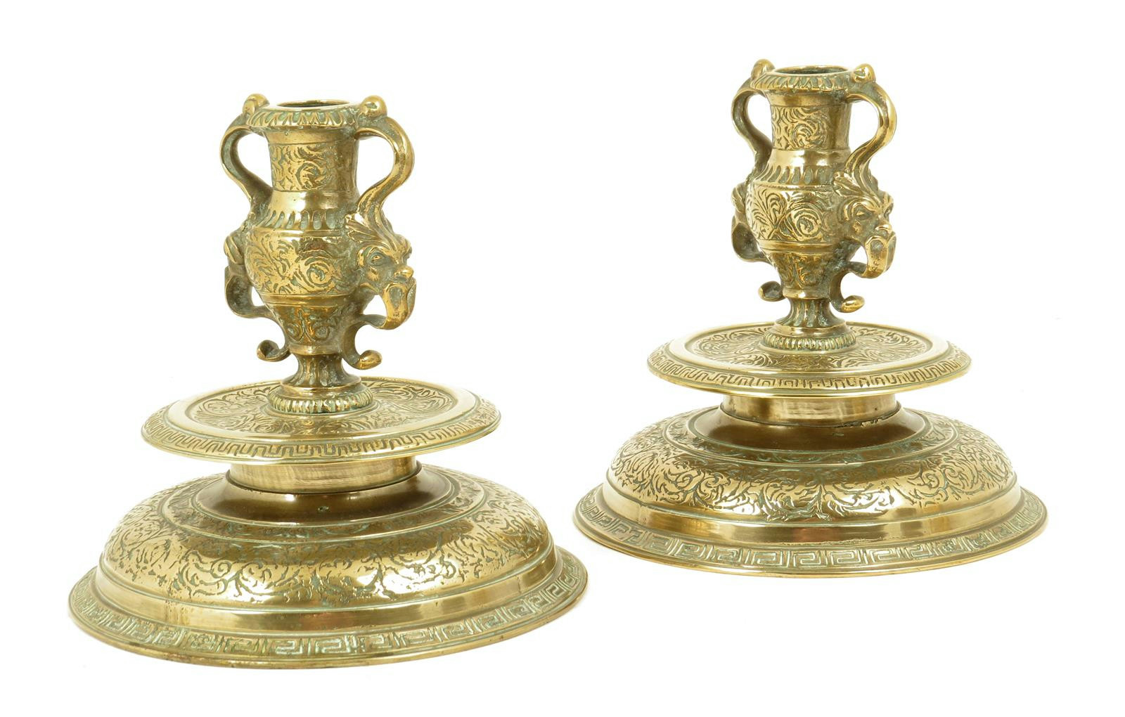 A pair of brass candlesticks, each with an urn nozzle with lion mask scroll handles, to an engraved domed base with a Greek key border, 15cm high, 16cm deep. (2)