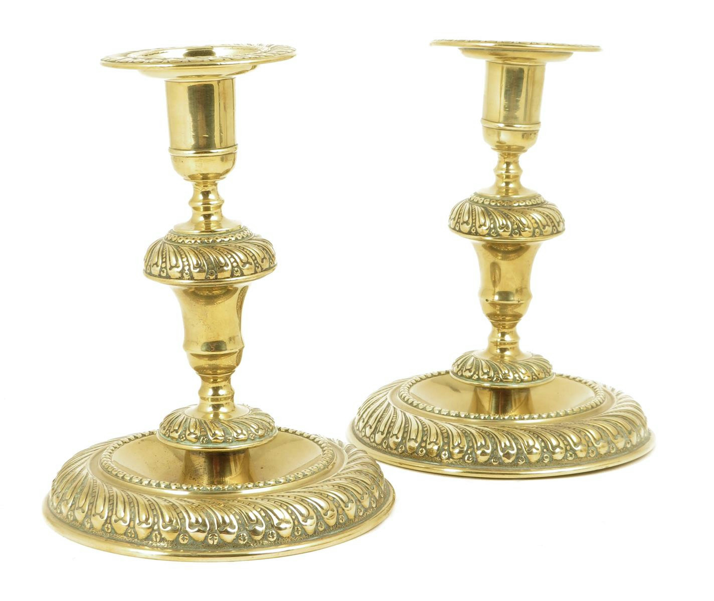 A pair of 19th century continental brass candlesticks, each with detachable sconces and with spiral lobed bands, the undersides inscribed 'RL / Each', 17.7cm high, 13.8cm diameter. (2)