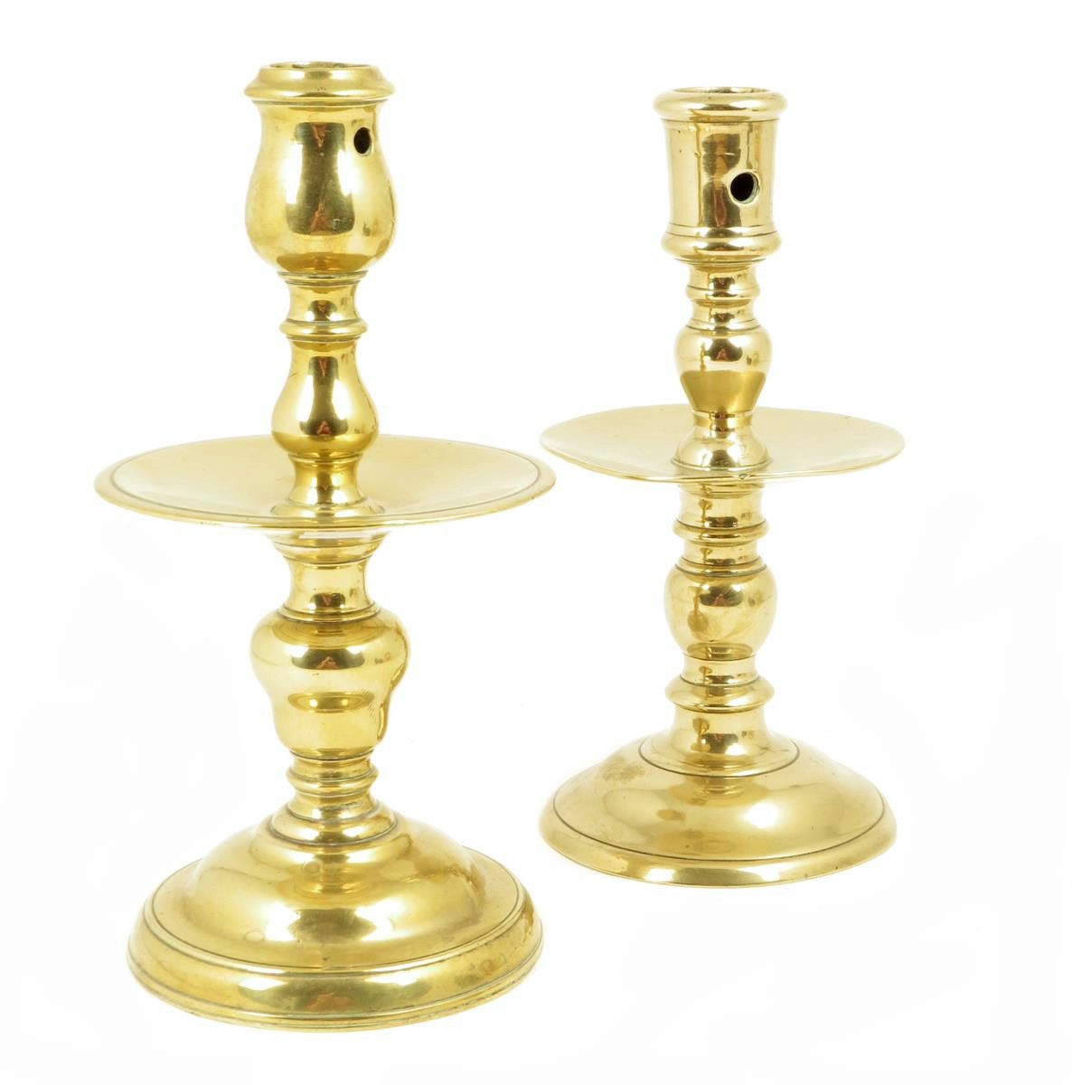 Two Dutch brass 'Heemskerk' candlesticks, each with a pierced extracting nozzle and a turned stem to a dished drip-pan on a domed foot, 17th / 18th century, 20.7cm high, 10.5cm diameter, max. (2)