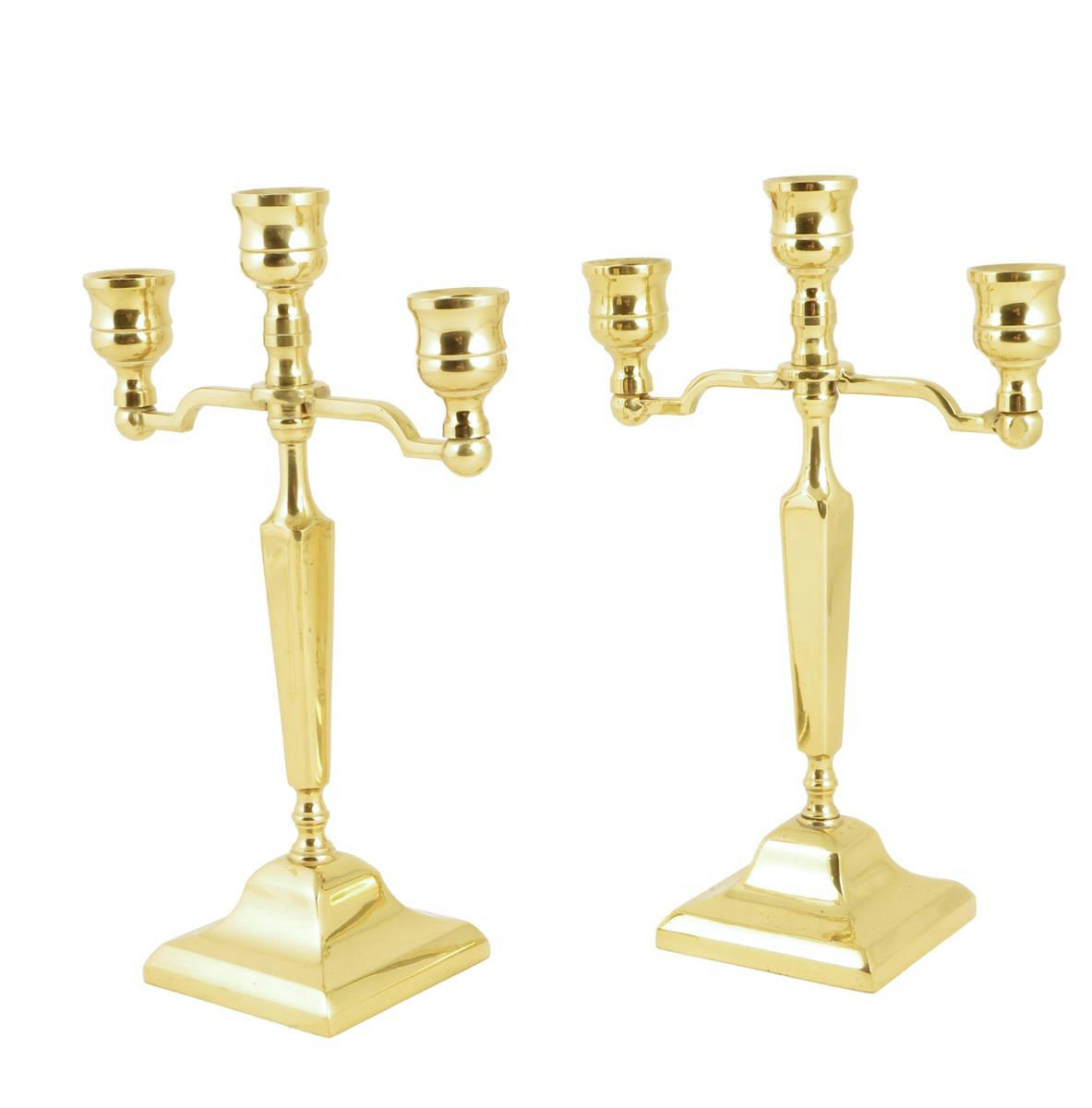 A pair of Edwardian brass candlesticks, each with three sconces, stamped 'MADE IN ENGLAND', 23.5cm high, 16cm wide. (2)