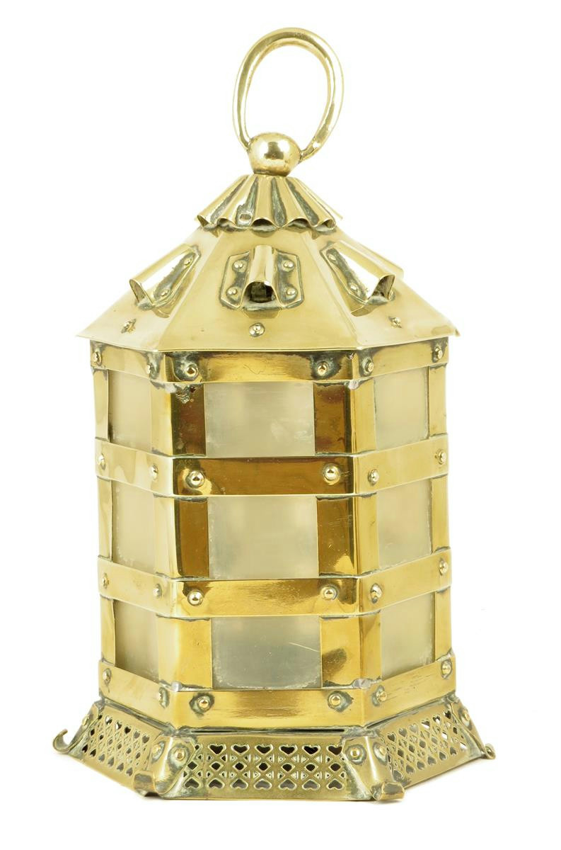 A hexagonal brass pendant lantern, with a fixed ring handle to horn panels and a pierced heart and 'X' apron, the underside with a detachable candle holder, early 19th century, 30.7cm high, 18.8cm wide.