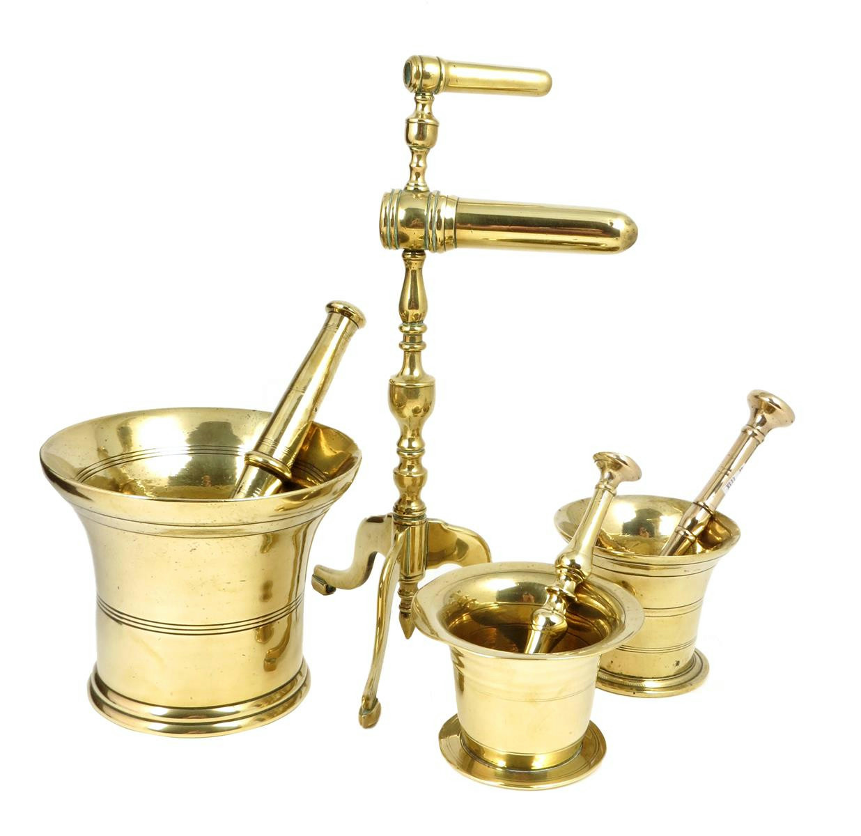 A George III brass goffering iron, with a vase turned stem and on tripod supports, 36.2cm high, together with three brass mortars with pestles. (7)