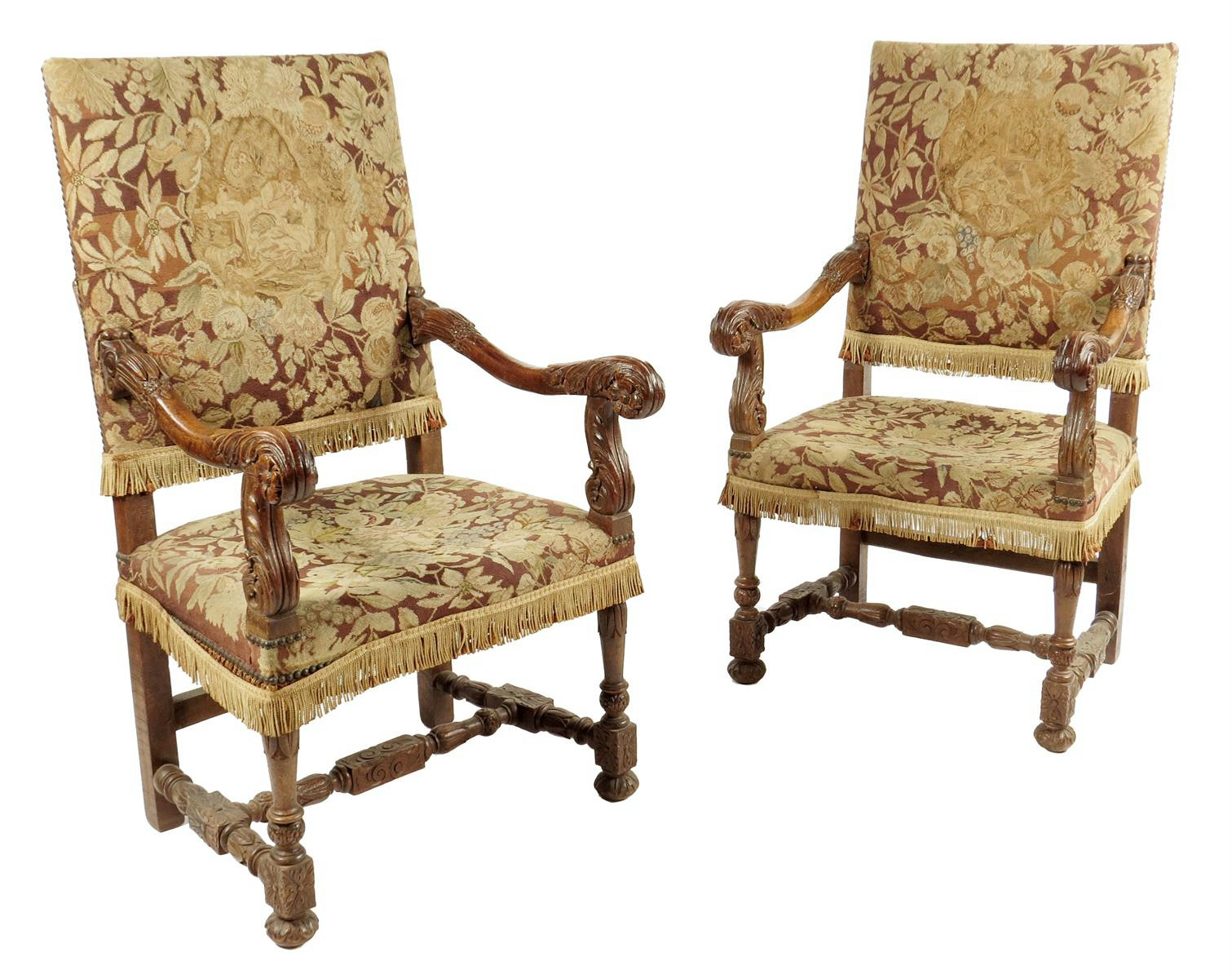 A pair of late 17th century style walnut open armchairs, each with a tapestry back and seat, the leaf and flower carved arms on tapering stretchered legs, 19th century. (2)