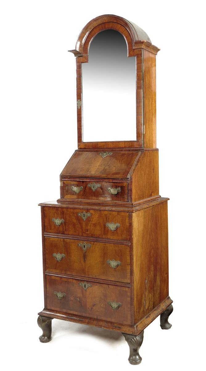 A walnut bureau cabinet on chest in early 18th century style, the arched cornice above a mirrored door enclosing shelves, a cupboard and three drawers, above a hinged fall revealing pigeon holes, two drawers and a cupboard, to a shaped front drawer, the base with three long drawers on shell capped cabriole legs and pad feet, 198.9cm high, 67.8cm wide, 56cm deep.