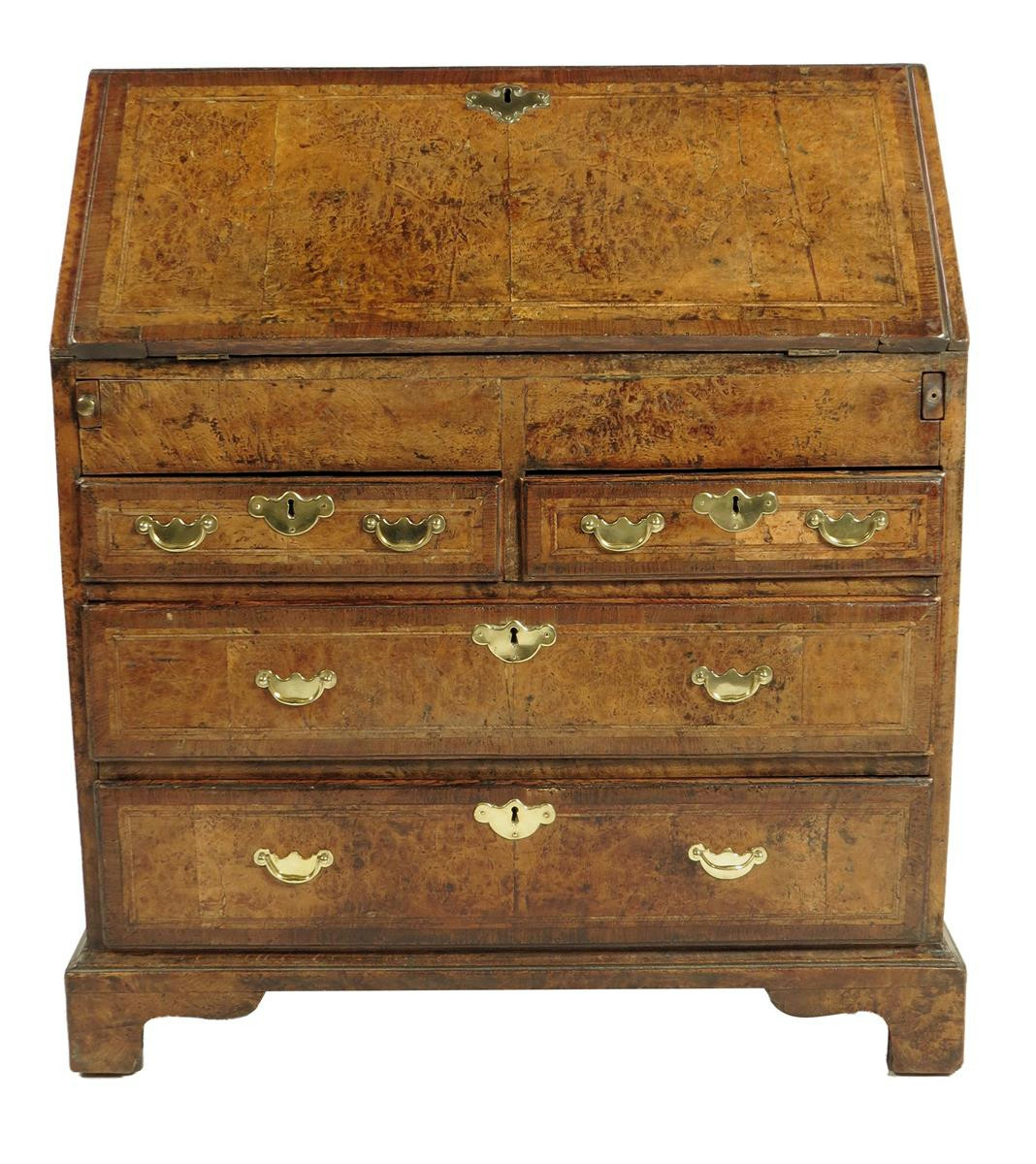 An early George II burr oak and walnut bureau, cross and feather banded, the interior with pigeon holes drawers and a central arched cupboard, flanked by secret pilaster compartments above a well with a sliding cover above two short and two long drawers fitted with later brass work on bracket feet, 96cm high, 86.4cm wide, 49.5cm deep.