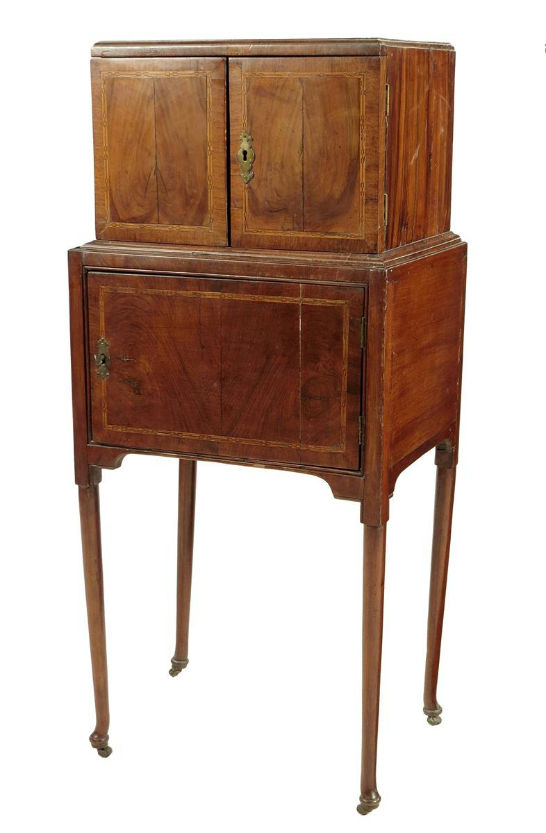 A walnut cabinet on stand, inlaid stringing, the moulded edge top above a pair of drawers enclosing an arrangement of six drawers with brass drop handles, the base with a cupboard door on turned legs, pad feet and leather roller castors, early 18th century, 103cm high, 45.5cm wide, 33.5cm deep.
