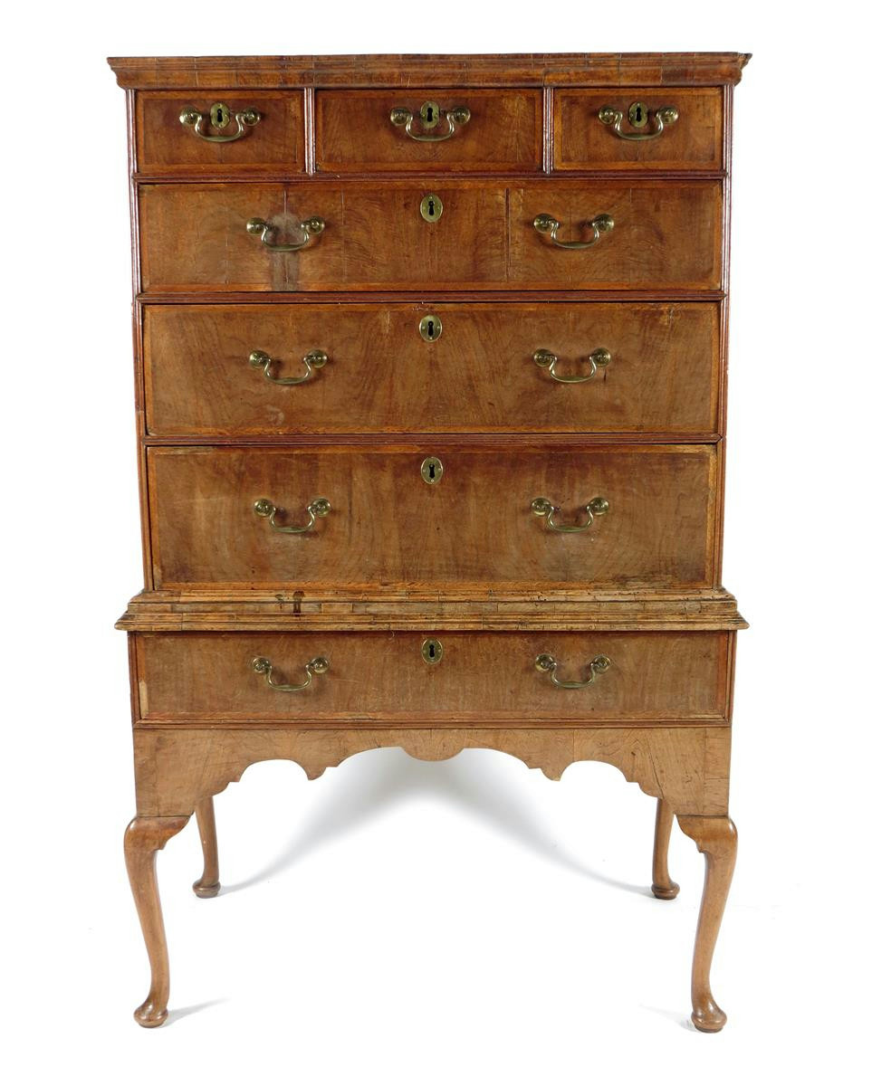 An early 18th century walnut chest on stand, with oak sides with three short and four long feather banded drawers, fitted with later brass handles on cabriole legs, 155.2cm high, 99.4cm wide, 57cm deep.