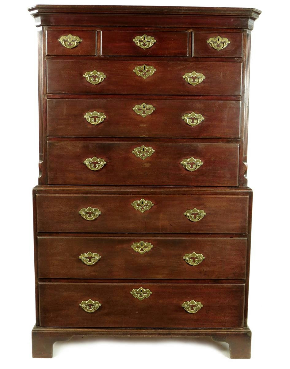 A George II mahogany chest on chest, of three short and three long graduated drawers flanked by fluted canted angles, the base with three long drawers, fitted with brass bat's wing handles, 182.3cm high, 118cm wide, 59.9cm deep.