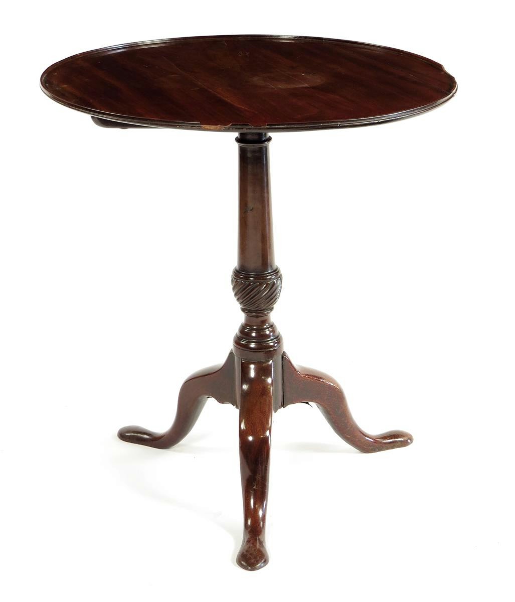 A mahogany tripod table, the circular dished tilt-top on a turned stem to a spiral twist bowl, George III, top and base probably associated, 67.8cm high, 63.cm diameter.