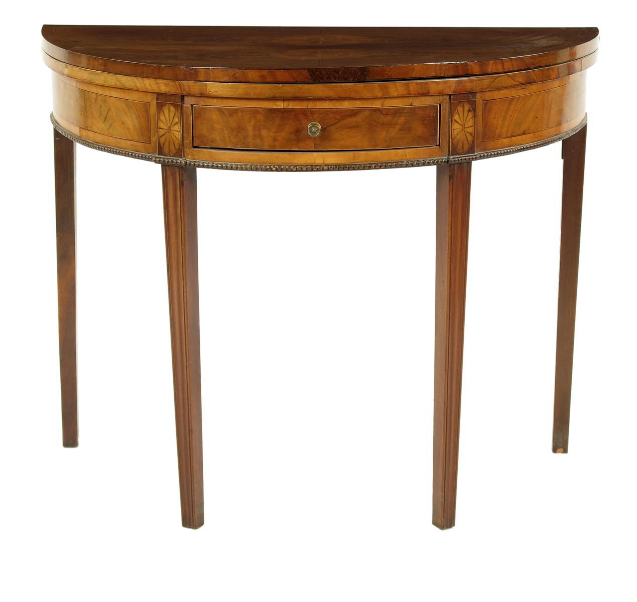 A late 18th century mahogany card table, with inlaid stringing and a frieze drawer, 73.6cm high, 91.5cm wide, 45cm deep.
