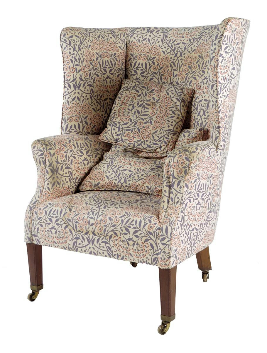 A 19th century mahogany wing armchair, on square tapering legs to brass caps and castors.