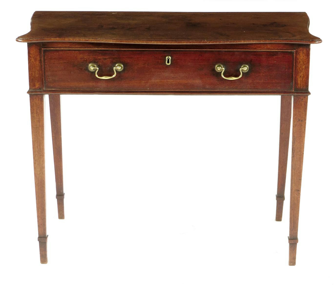 A George III mahogany side table, the serpentine moulded edge top above a frieze drawer fitted with brass handles on square tapering legs with applied block ankles, 75cm high, 92cm wide, 50.6cm deep.