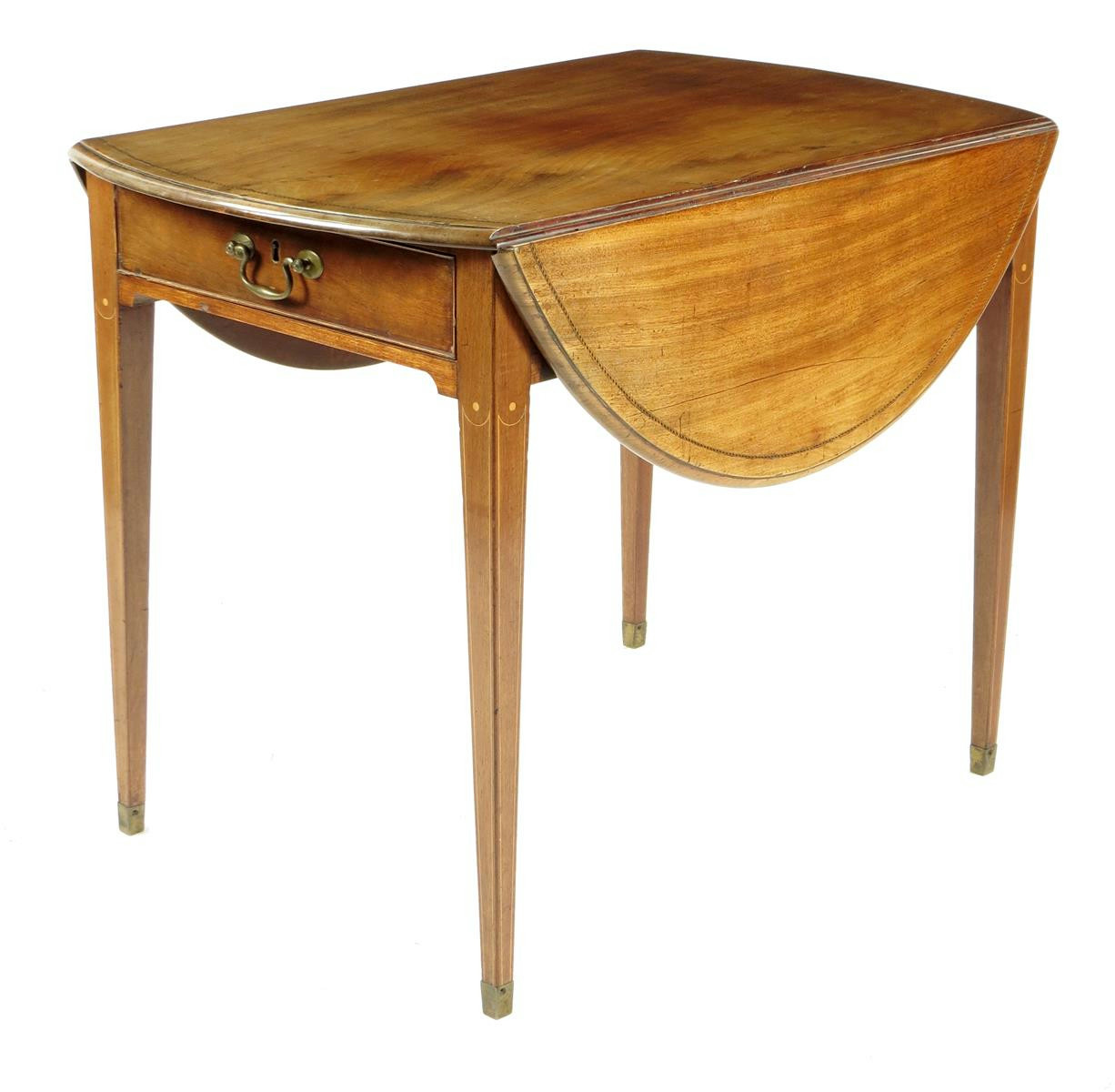 A George III mahogany Pembroke table, the drop-flap top with barber's pole stringing above a divided frieze drawer on brass caps, 69.3cm high, 56.7cm wide (closed), 90cm deep.