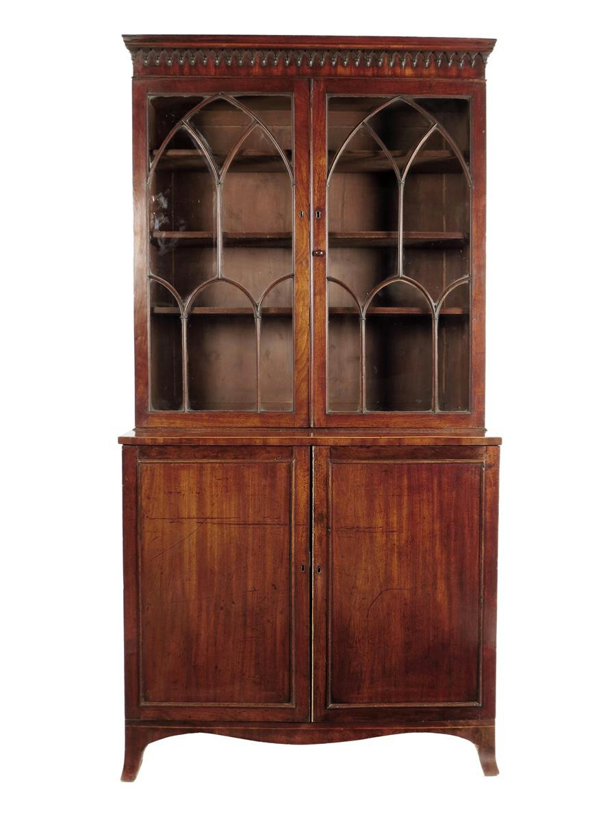 An early 19th century mahogany bookcase cabinet, the detachable cornice with a pendant moulding above a pair of lancet astragal glazed doors enclosing three shelves, the base fitted with two slides, 210.6cm high, 108.7cm wide, 56.5cm deep.