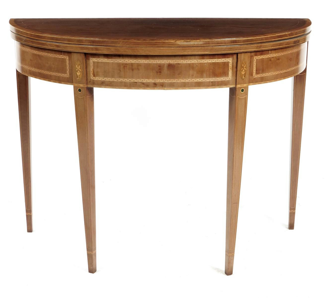 A George III mahogany demi-lune tea table, the satinwood banded fold-over top on twin gate supports, the banded frieze with urn and flower paterae, 75.6cm high, 99.6cm wide, 44.5cm deep.
