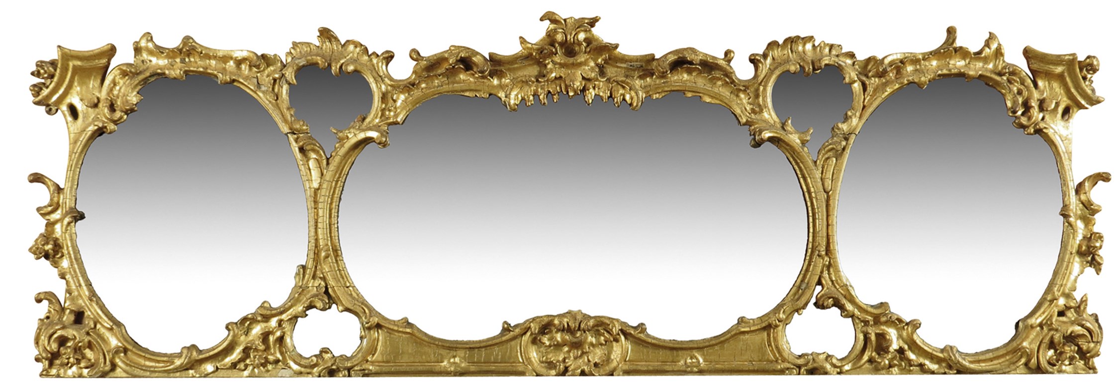 A George III giltwood and gesso overmantel mirror, with seven plates to a scroll and rocaille decorated frame, 53.5 x 150cm.