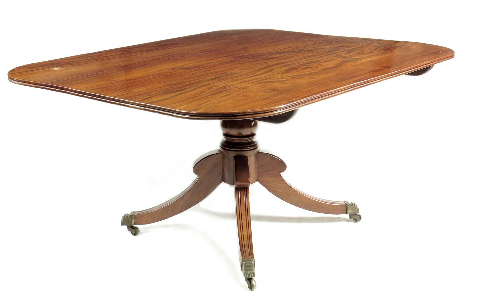A George IV mahogany breakfast table, the reeded edge tilt-top on a turned stem and four hipped downswept legs terminating in brass caps and castors, 71.7cm high, 125.9 x 149.5cm.