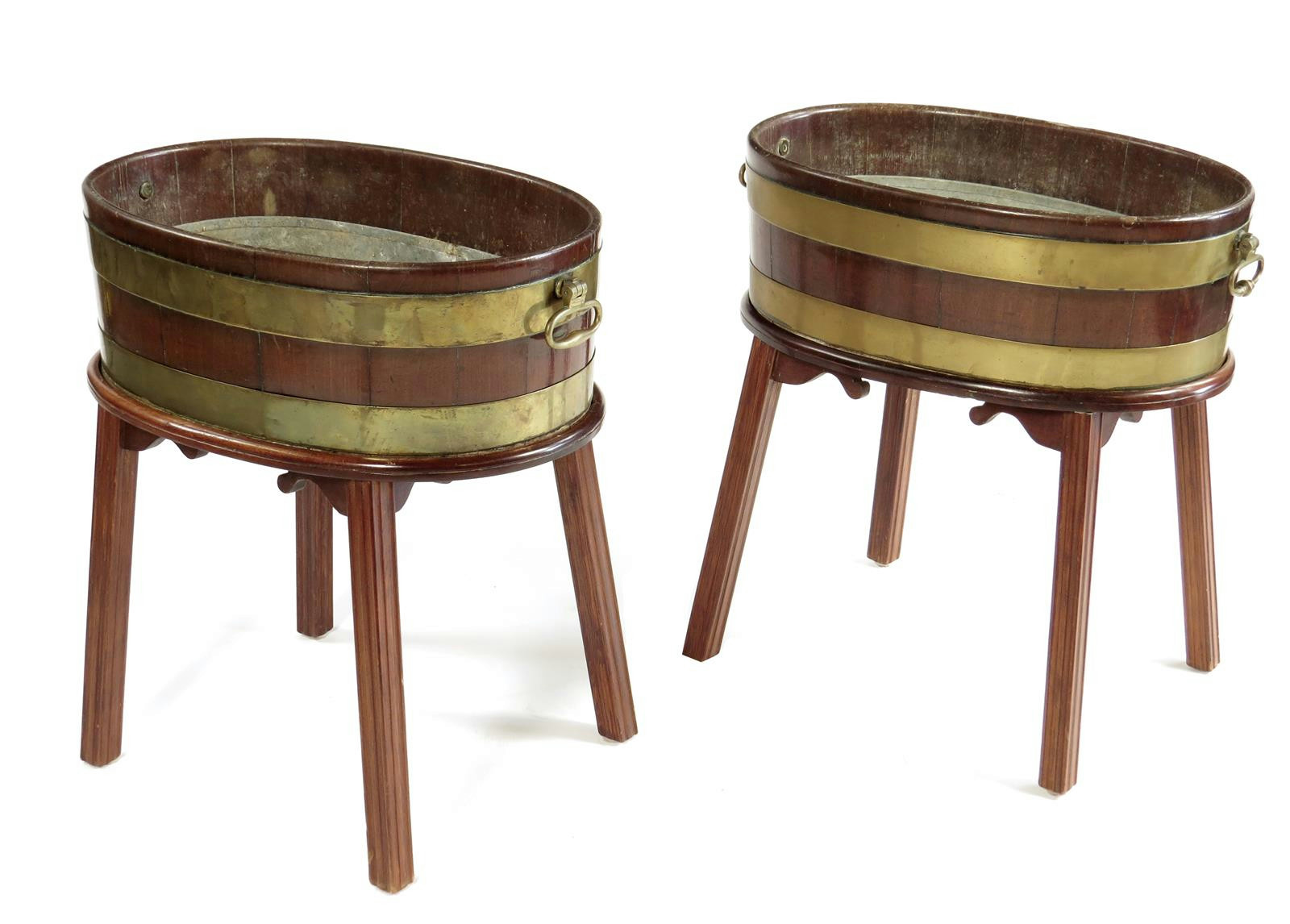 A near pair of George III mahogany and brass bound wine coolers, with differing brass handles on later mahogany stands and with zinc liners. 65.5cm high, 64.5cm wide, 43.9cm deep. (2)