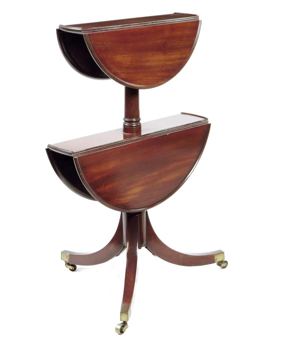 A George III mahogany two tier dumb waiter, with dished drop-leaf tops on a turned stem, splay legs with brass caps and castors, 93.3cm high, 62.3cm diameter.