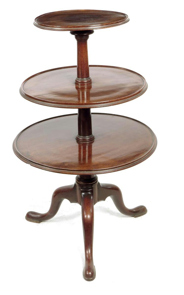 A George III mahogany dumb waiter, with three graduated dished tiers on a turned stem and tripod supports, 98.6cm high, 61.4cm diameter.