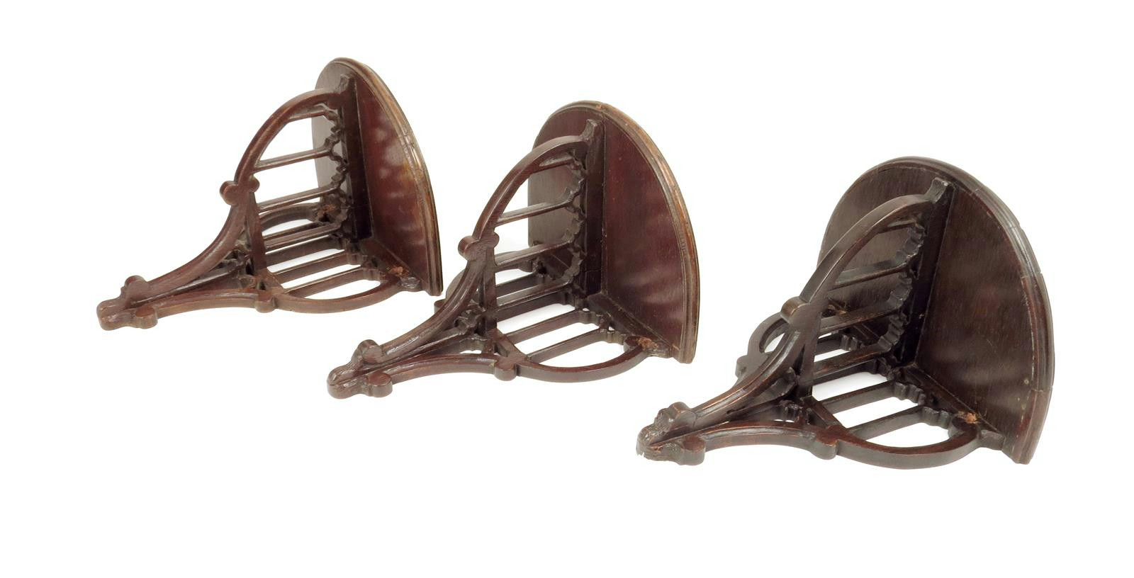 Three 19th century mahogany wall brackets, each with carved and pierced Gothic tracery supports, 21.4cm high, 20.3cm wide, 14.3cm deep, max. (3)