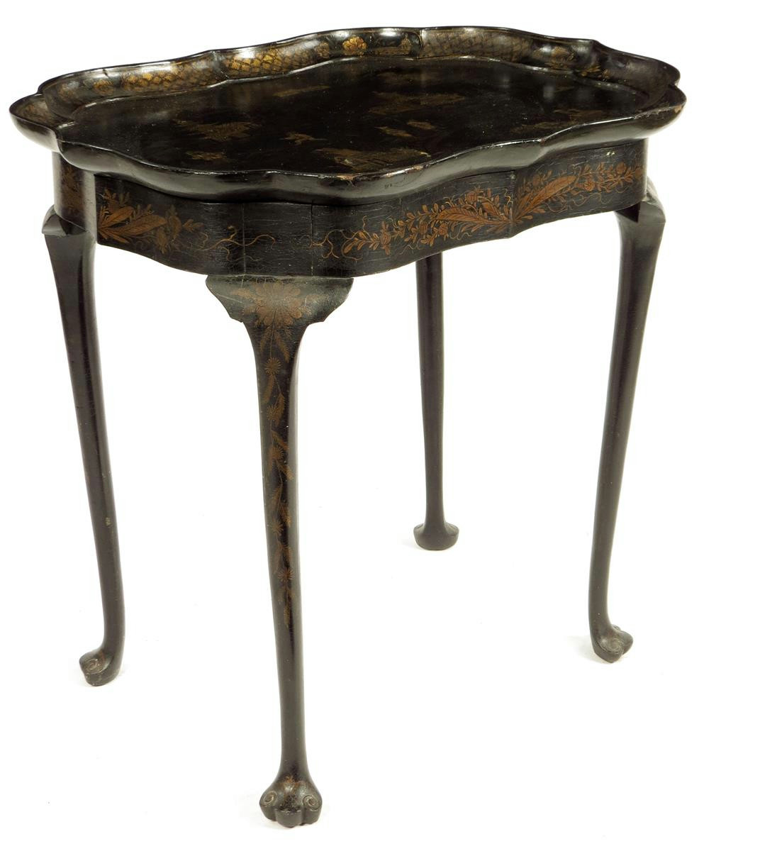 An early 19th century papier-mache tray, decorated in gilt with chinoiserie scenes, fixed on a conforming stand decorated with flowers and leaves, 78.8cm high, 80.7cm wide, 61.8cm deep.