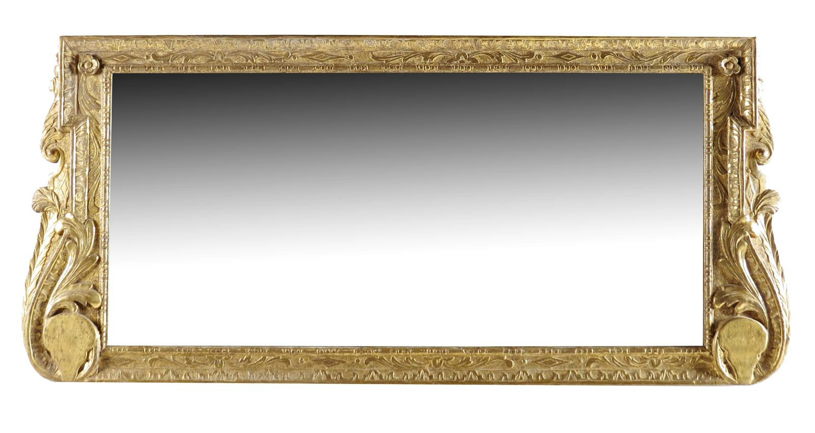 A George II giltwood and gesso overmantel mirror, the replaced bevelled plate to a moulded and leaf carved frame on a punched ground, originally with candle sconces, 48.7 x 104cm.