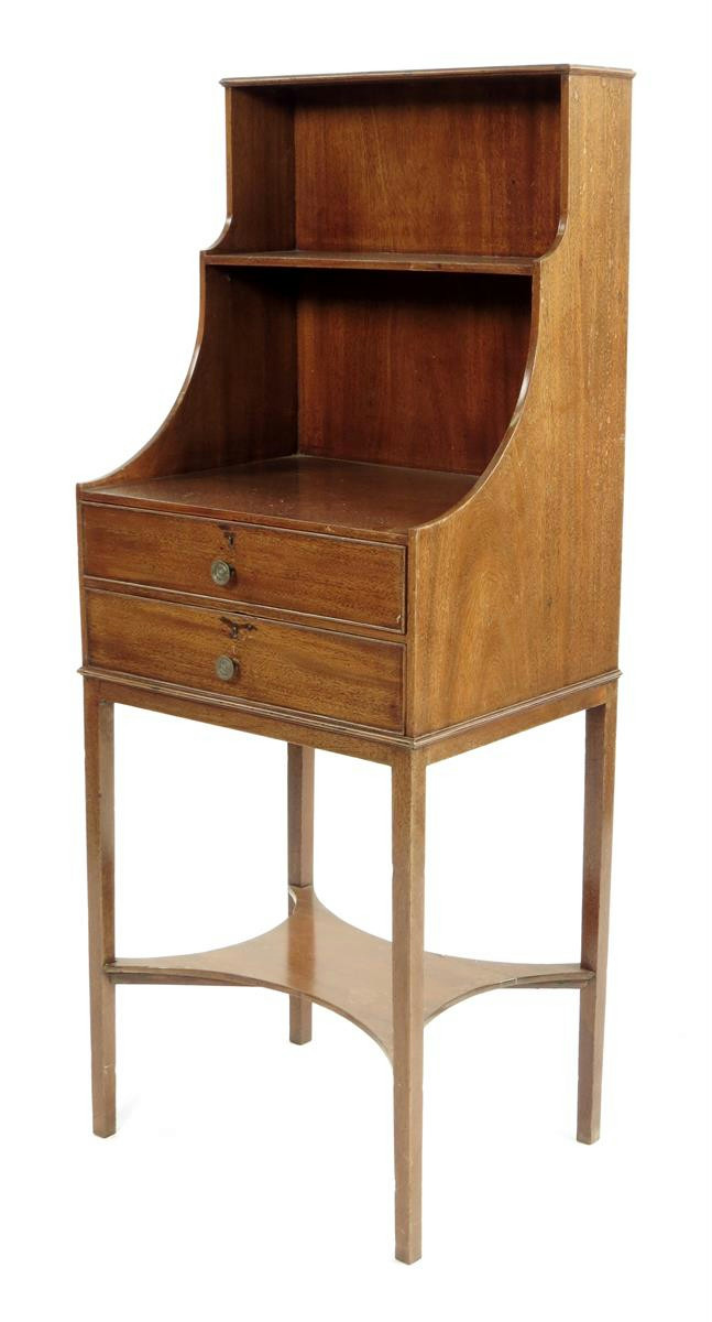 An early 19th century mahogany lady's bookcase, with open shelves above two part cedar lined drawers, the lower drawer fitted with ink compartments and a pen tray, 117.8cm high, 46.5cm wide, 36cm deep.