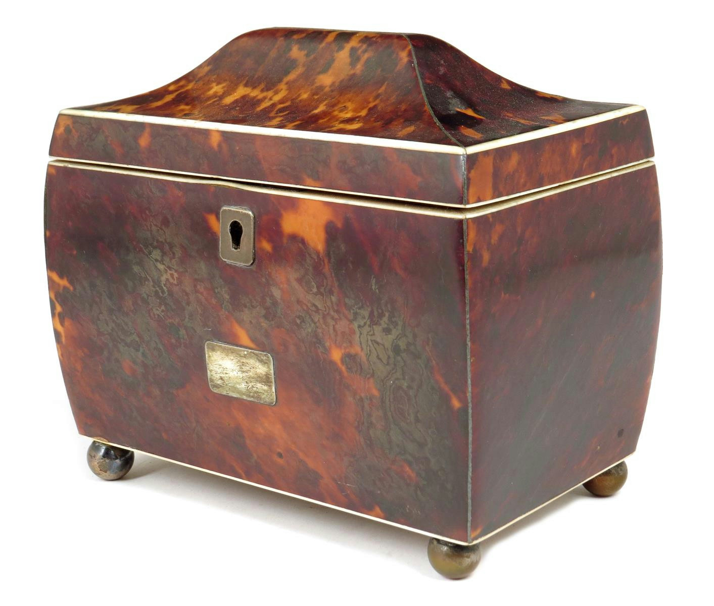 λ A Regency tortoiseshell sarcophagus shape tea caddy, with pewter and ivory stringing, the front with a vacant plaque, the interior with twin lidded compartments, on ball feet, 14.7cm high, 16cm wide, 9.5cm deep.