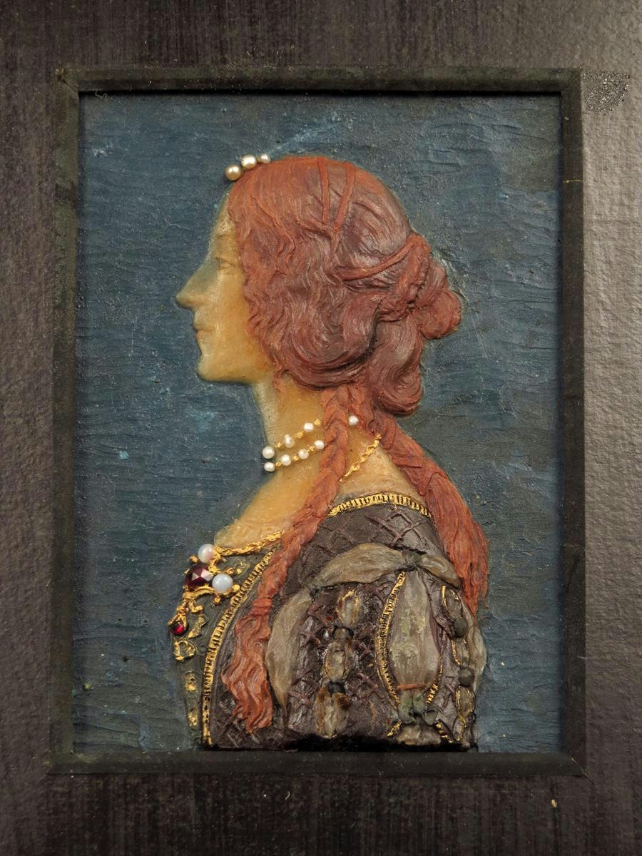 A rare pair of painted wax relief portrait busts attributed to the Casella sisters, of a bejewelled Italian lady and gentleman in Renaissance costume, late 19th / early 20th century, 8.1 x 5.9cm, within glazed ebonised frames. (2)