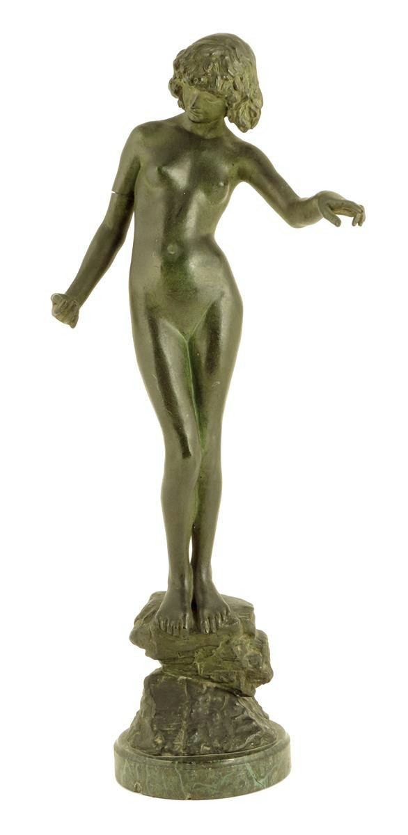A bronze model of a female nude, standing precariously on a rocky base, on a turned green marble plinth, unsigned, late 19th / early 20th century, 52.2cm high, 19cm wide.