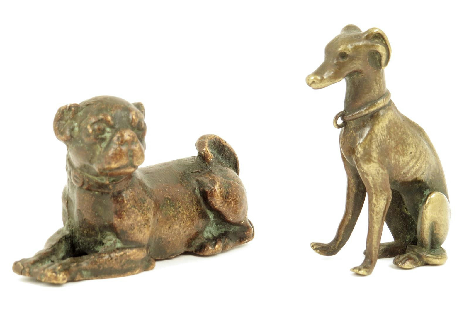 An early 19th century bronze recumbent pug, 3.6cm high, 7cm long and a bronze model of a seated greyhound. (2)