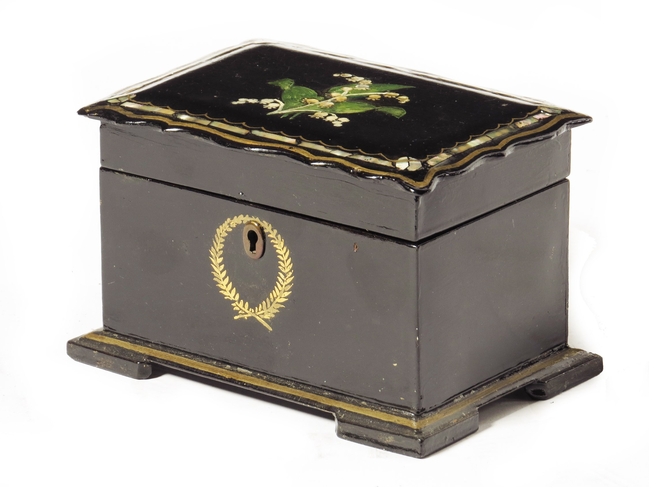 A Victorian papier-mâché tea caddy, inlaid with mother of pearl and painted with flowers and a gilt wreath, the interior with twin lidded compartments, 10.9cm high, 16.5cm wide, 11.5cm deep.