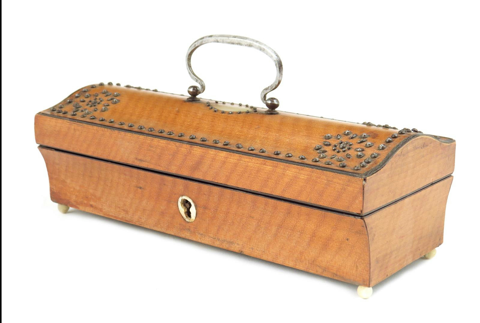 An early 19th century French satinwood and cut steel box, of sarcophagus shape with a faceted handle and mother of pearl plaque escutcheon and ball feet, 6cm high, 19cm wide, 8.2cm deep.