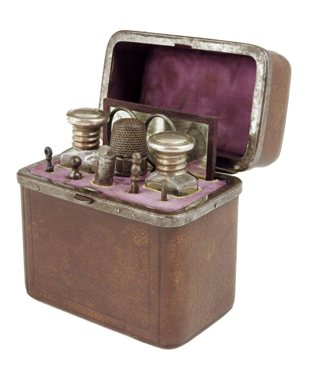 An early 19th century leather and steel mounted nécessaire, the silk and plush lined interior fitted with a mirror, scissors, stamped 'BUCK & RYAN', two glass scent bottles, a thimble and other sewing utensils, 9.4cm high, 8.8cm wide, 5.5cm deep.