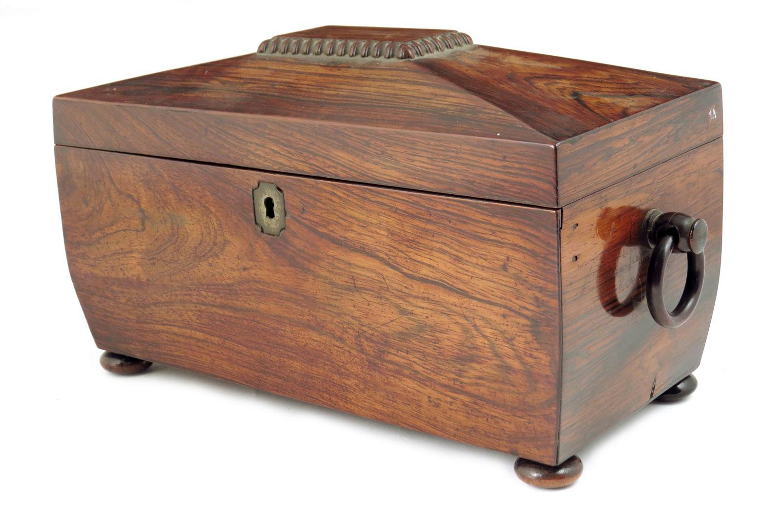 λ A William IV rosewood sarcophagus shaped tea chest