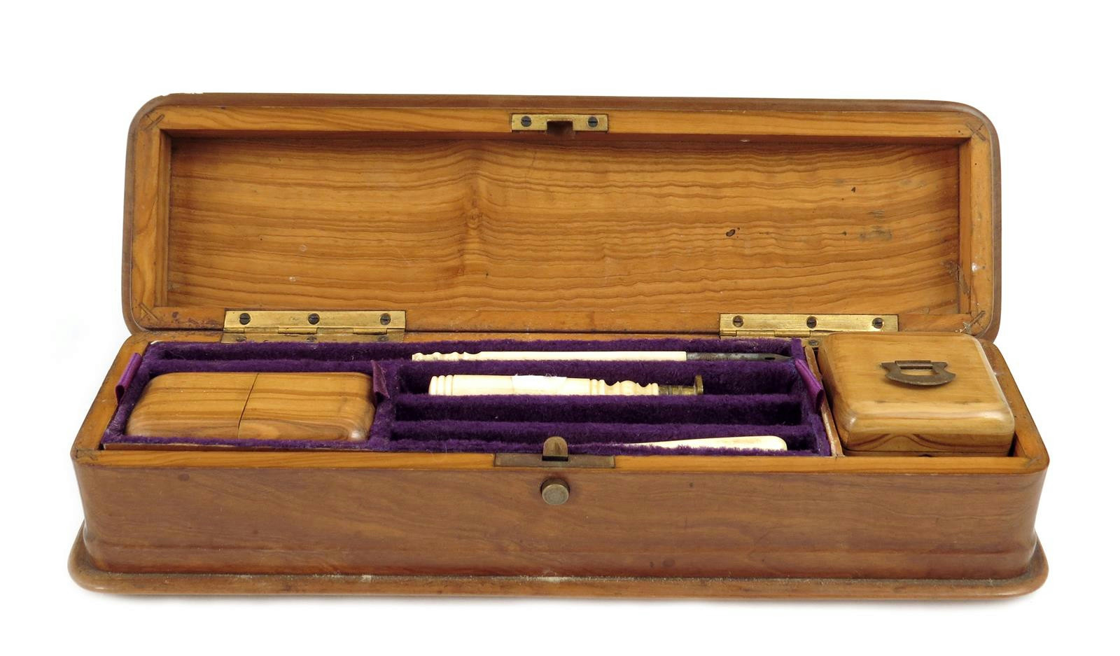A late 19th century Italian olivewood writing box, with a brass handle, the divided interior with a lift-out tray, an inkwell, bone handled pens and a seal, 8.8cm high, 26.5cm wide, 8.2cm deep.