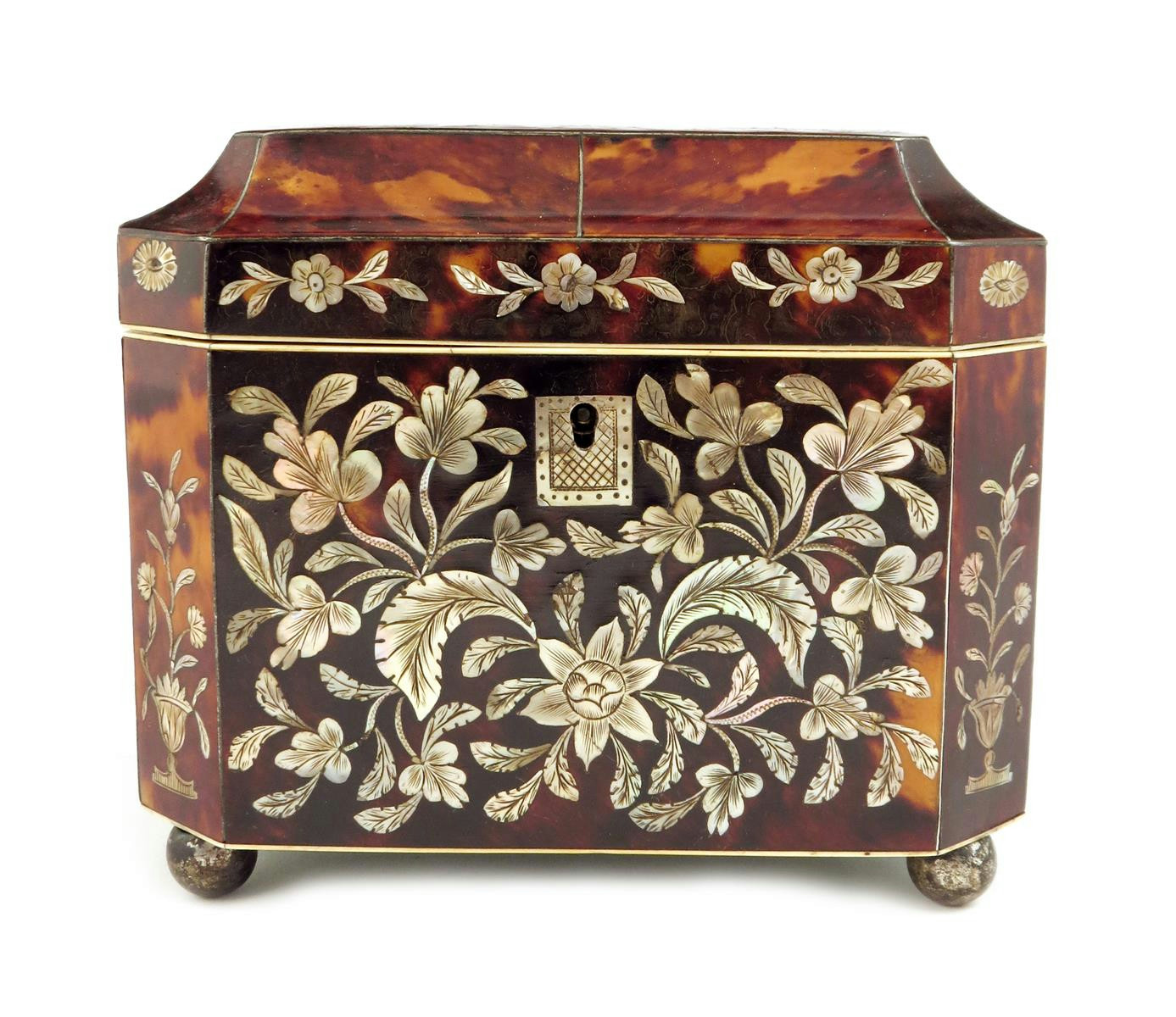 λ A late Regency tortoiseshell and mother of pearl inlaid tea caddy