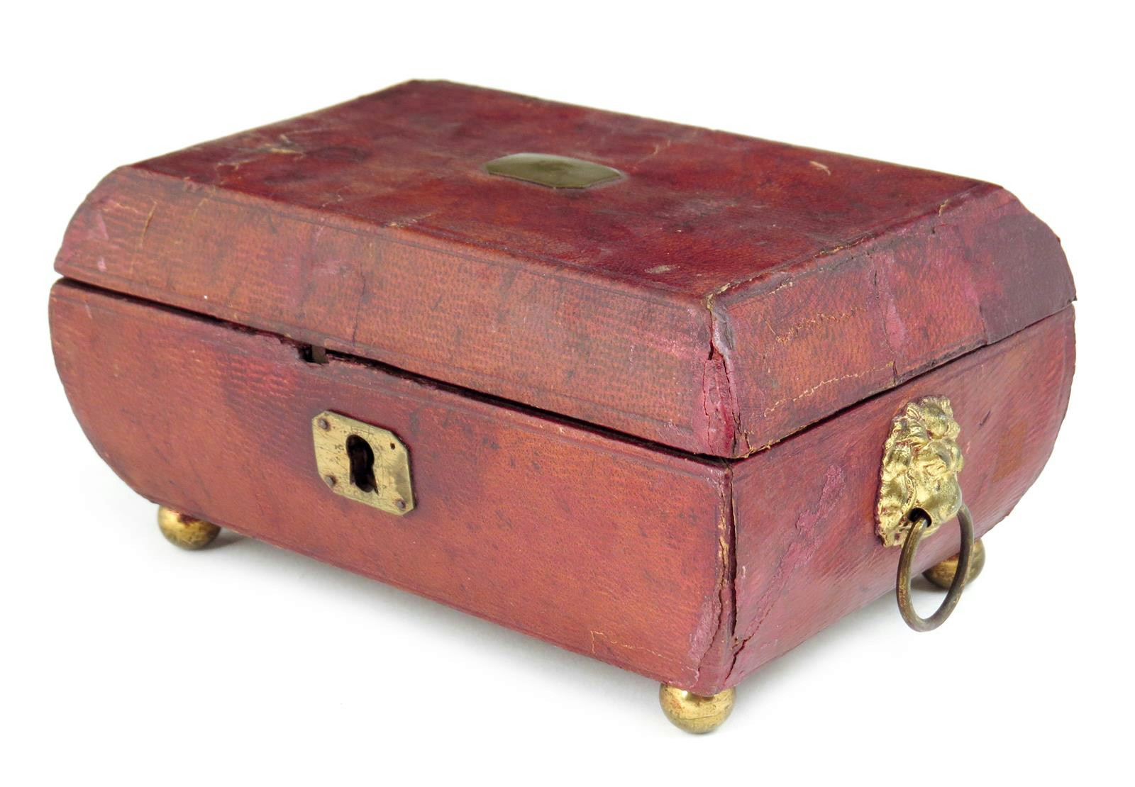 A Regency red leather sewing box, of sarcophagus form, and the hinged lid inset a brass plaque inscribed 'M. CORFIELD' to a fitted interior with a thimble pin book with a trade label inscribed 'W. TAYLOR 98 CHEAPSIDE MANUFACTURER', the lid with a later inset engraving with lion's mask ring handles and ball feet, 6.7cm high, 15cm wide, 9.4cm deep.