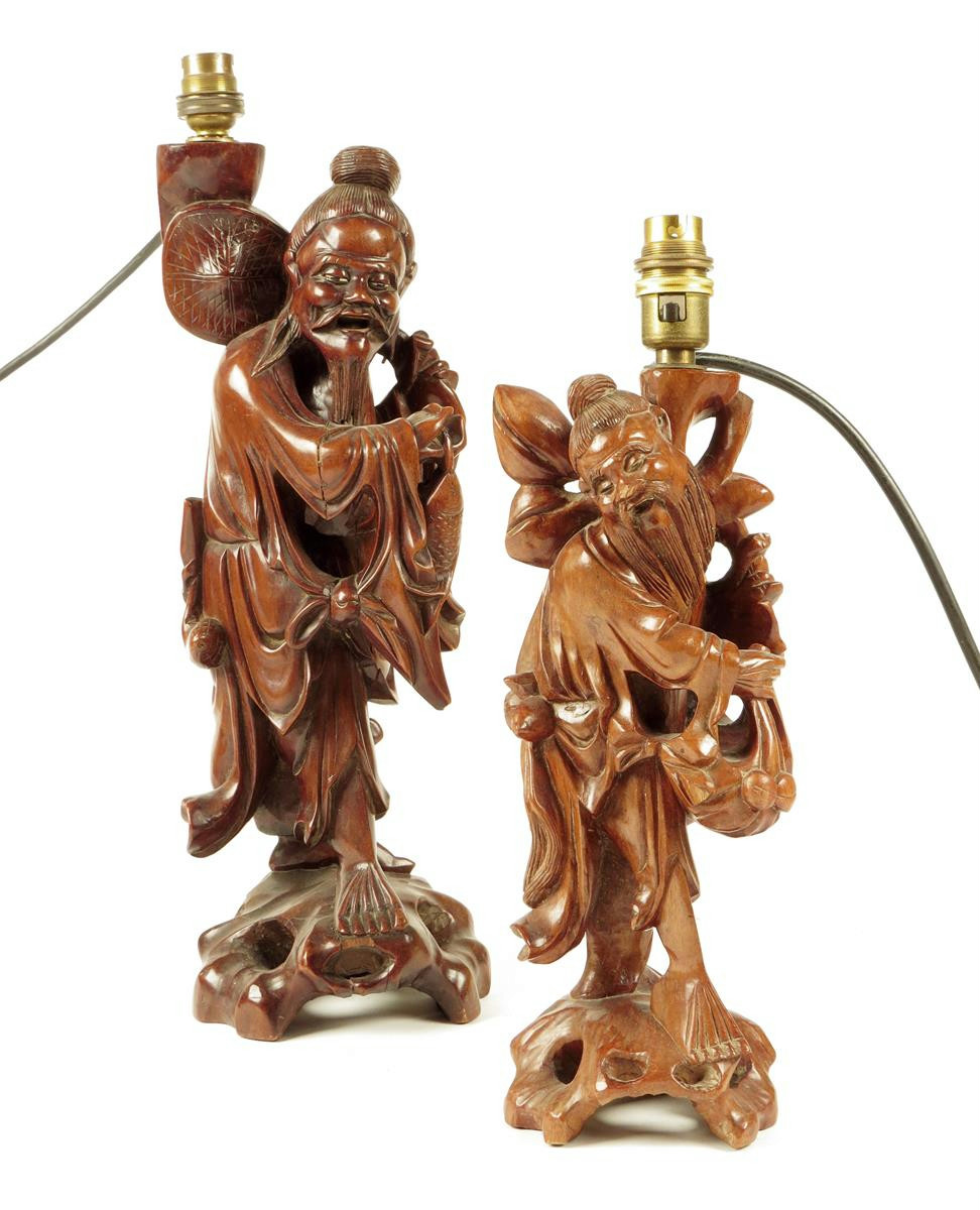 Two Chinese carved hardwood table lamps, of bearded men, one holding a fish, the other a basket, 45.3cm high, 14.6cm wide, max. (2)
