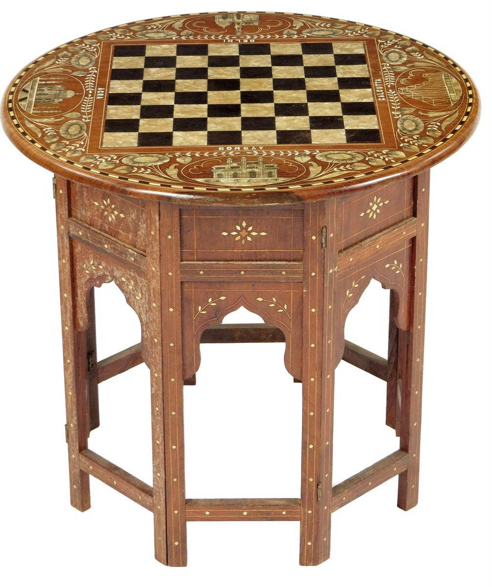 λ An Indian rosewood and ivory inlaid occasional table, the circular detachable top inlaid an ebony and mother of pearl chequer board flanked by oval panels of famous buildings and titled 'BOMBAY, CALCUTTA, DELHI, AGRA' within scrolling flowers and foliage, the underside with the remains of paper labels on a folding octagonal base, late 19th / early 20th century, 52.5cm high, 55.5cm diameter.
