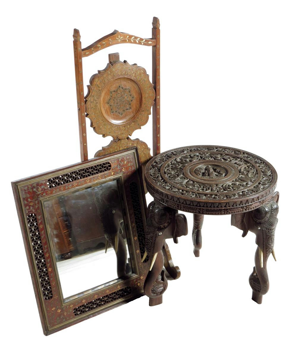 An Indian carved occasional table, on elephant's head legs, 39.3cm high, 38cm wide, an Indian hardwood and brass inlaid folding cake stand, with paper labels inscribed 'MADE IN BRITISH INDIA' and a brass inlaid mirror. (3)