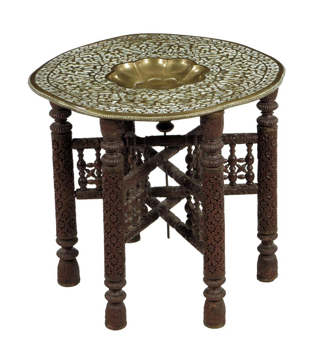 An Indian brass and carved hardwood folding occasional table