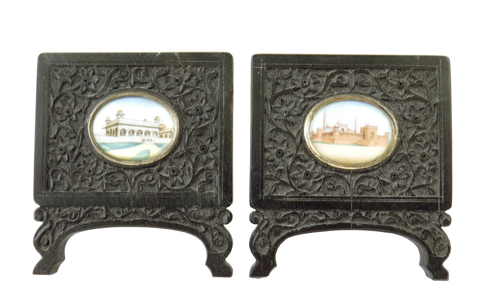 λ A pair of late 19th century Indian miniatures, painted on ivory with views of Jama Masjid and the Red Fort, within carved ebony frames, and brass easel backs, 9.3 x 8.3cm. (2)