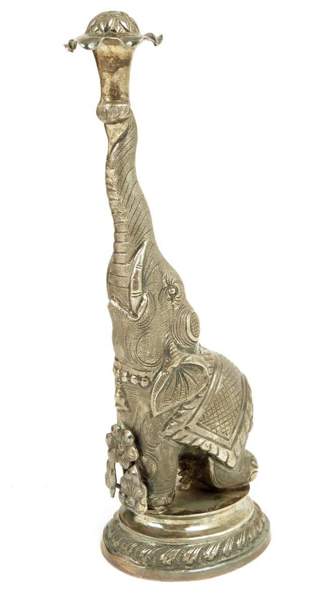 An Indian silver rosewater sprinkler, in the form of a kneeling elephant, with a screw-off flower stopper, late 19th century, 22.6cm high.