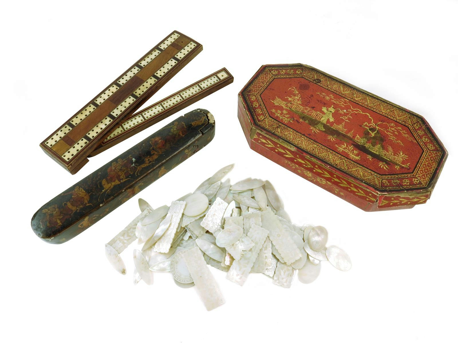 A Persian papier-mâché pen box qalamdan, painted with hunting scenes, Qajar 19th century, 23.2cm long, a small collection of Chinese mother of pearl counters, engraved with flowers and a cribbage board. (3)