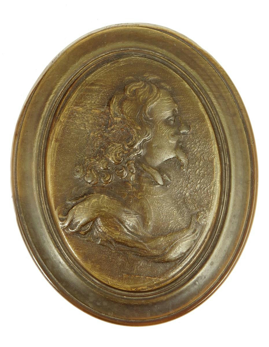 An early 18th century pressed horn snuff box in the manner of John Obrisset, the lid with a portrait bust of Charles I after John Roettiers, the base with initials 'J J', 3.9cm high, 8cm wide, 10cm long.