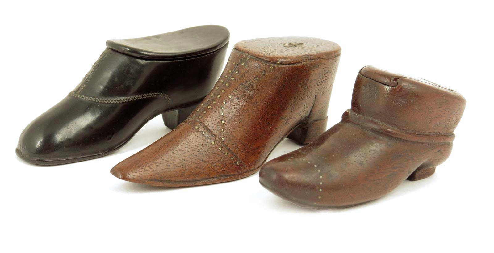 Three 19th century snuff shoes, two treen examples with brass tack inlay and a papier-mache shoe with a hinged cover, 9cm long, max. (3)